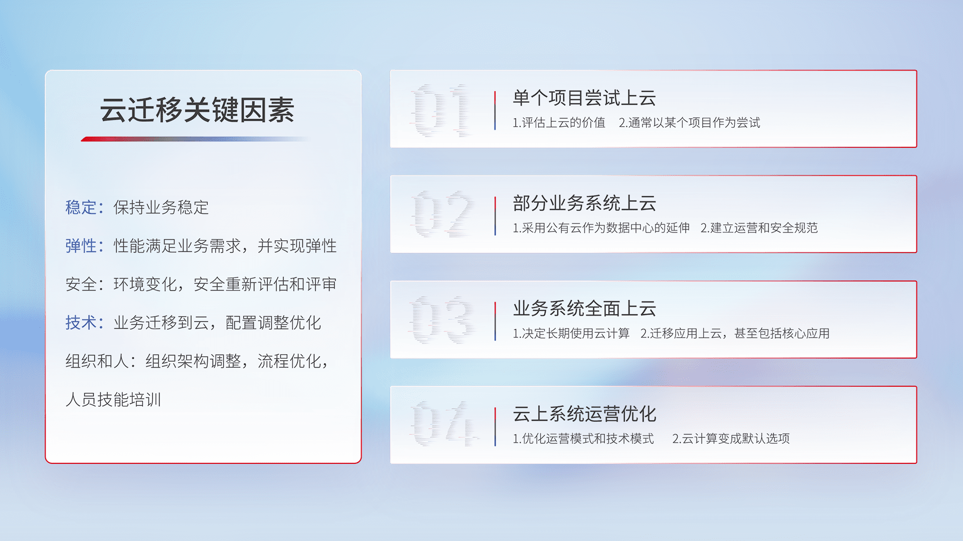 结合实际业务,,,从规划设计、、、、云平台选型、、云原生改造、、、、数据迁移、、集成交付,,,,迁移全过程为客户识别最佳上云路径,,,,做好风险识别管理,,设计网络架构、、、、身份权限、、、安全审计合规、、、操作审计、、、、日志审计、、监控告警策略、、、、多站点容灾设计等,,,,对云上基础设施进行整体规划,,提升IT治理水平,,以满足弹性、、、、高可用、、、高性能的需求。。。。