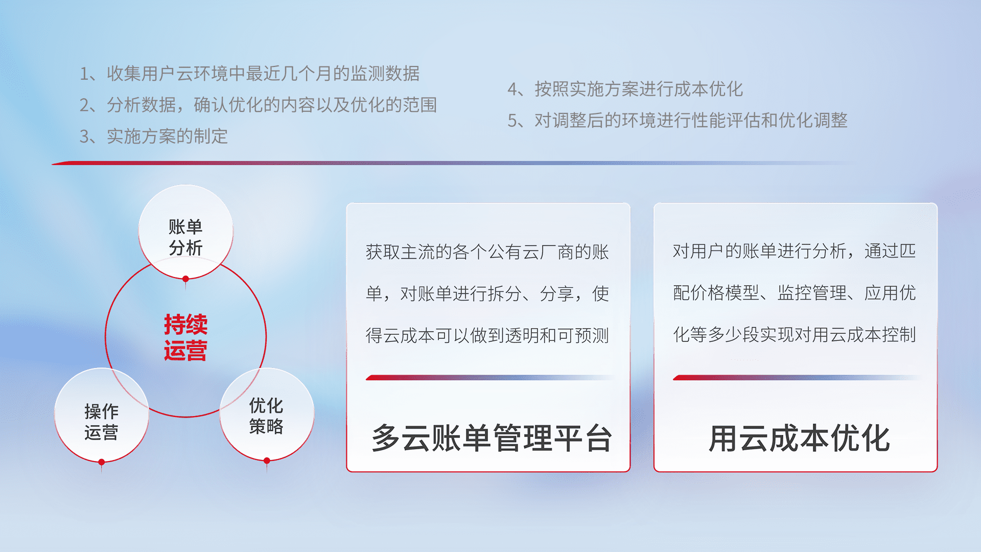 通过多云纳管,,,,以统一的资源数据模型把客户的云资源进行抽象和封装,,,,进而实现对多云资源的统一操作,,保障云资源管理的可靠性、、、稳定性与可用性。。量身定制化运维内容,,,配置、、、开发运维、、补丁管理、、、、备份、、监控、、认证和访问管理、、、审计和日常巡检等,,,,保障在用云过程中的可靠度,,,,稳定度以及高可用率。。