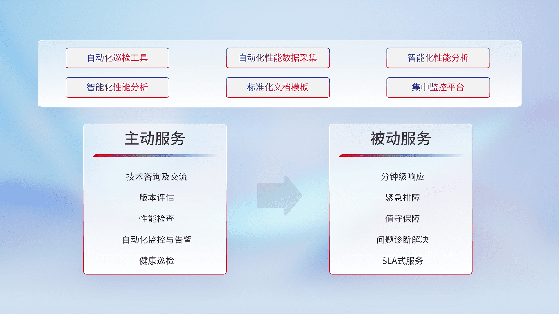 智能化工具和标准化文档,,,保障服务质量,,提供主动服务(包含技术咨询、、、版本评估、、、性能检查、、、自动化监控与告警、、健康巡检)和被动服务包含(分钟级响应、、、紧急排障、、、值守保障、、、问题诊断解决、、、、SLA服务)。。。。